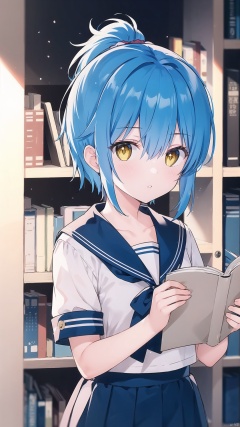 book, 1girl, yellow eyes, bookshelf, library, blue hair, solo, bangs, hair between eyes, parted lips, ponytail, looking at viewer, blurry background, blurry, holding, indoors, short hair, blue sailor collar, sailor collar,,,,,,