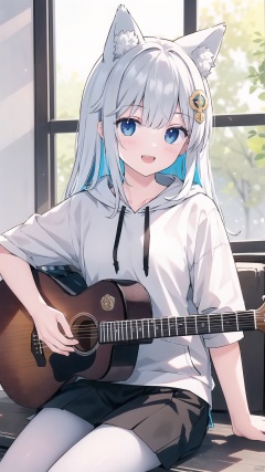 (ultra-detailed), highres, original, tabheadstyle, oimo_imoo, lapingrisstyle1, (best quality), (detailed eyes), ((masterpiece)), sunlight through the window, 1girl, wolf ears, acoustic_guitar, bangs, blunt_bangs, drawstring, hair_ornament, holding, hood, hood_up, hoodie, instrument, long_hair, multicolored_hair, music, open_mouth, sharp_teeth, sitting, smile, solo, , white pantyhose,,,,,,
