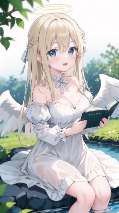 scenery, nature, outdoors, tree, forest, reflection, water, day, sunlight, grass, moss, river, rock, blurry, deer, animal .1girl, dress, long hair, wings, solo, book, holding, white dress, halo, open mouth, ribbon, blonde hair, bare shoulders, looking at viewer, hair ribbon, off shoulder, holding book, white ribbon, bangs, angel wings, feathered wings, white background, angel, sparkle, off-shoulder dress, long sleeves, grey eyes, white wings, simple background, puffy sleeves, teeth, hair between eyes, upper teeth only, breasts, very long hair, cleavage ///////////,,,,,,