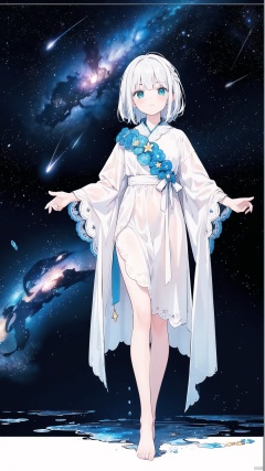 ((green, silver, glimmer)), limited palette, contrast, phenomenal aesthetic, best quality, sumptuous artwork, (masterpiece), (best quality), (ultra-detailed), (((illustration))), ((an extremely delicate and beautiful)), (detailed light), qua theme, cold theme, broken glass, broken wall, ((an array of stars)), ((starry sky)), the Milky Way, star, Reflecting the starry water surface, (1girl:1.3), awhite hair, blinking, white dress, closed mouth, constel lation, flat color, noline art, white hair, braid, blinking, white robe, barefoot, float, flat color, looking up, standing, medium hair, standing, solo, space, universe, Nebula, many stars, fanxing,,,,,,