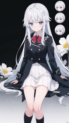 (1girl:0.6), thin, very long hair, black and grey hair, grey eyes, (detailed eyes), small breasts, black coat, white lining, white skirt, socks, closed mouth, (sad), star, Bow head, white flower, (black background), masterpiece, best quality, official art, extremely detailed CG unity 8k wallpaper, cozy anime,,,,,,