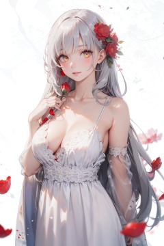 masterpiece,best quality,(realistic:1.2),1girl,solo,looking at viewer,silver hair,yellow eyes,beautiful and detailed face,evil smile,upper body,collarbone,collarbone,large breasts,white long translucent night gown,expressionless,hair cover one eye,long hair,red hair flower,standing,blood,(plenty of red petals:1.35),white background),simple background,