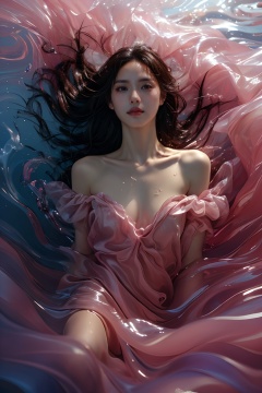 sd mai, piao, 1girl, solo, breasts, long hair, realistic, brown hair, pink dress, dress, looking at viewer, parted lips, water, bare shoulders, medium breasts, lips, mole, collarbone, partially submerged<lora:piao:0.8>