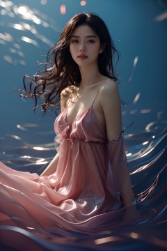 sd mai, piao, 1girl, solo, long hair, realistic, dress, breasts, looking at viewer, bare shoulders, parted lips, lips, pink dress, brown hair, water, black hair, collarbone <lora:飘piao:0.7>
