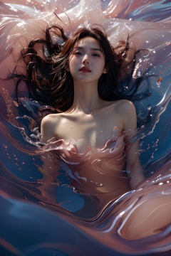 sd mai, piao, 1girl, solo, breasts, long hair, realistic, partially submerged, water, parted lips, nude, lips, brown hair <lora:飘piao:0.8>
