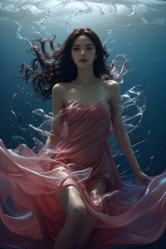 sd mai, piao, 1girl, solo, brown hair, long hair, underwater, dress, brown eyes, parted lips, realistic, water <lora:飘piao:0.8>