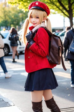 1girl, klee (genshin impact), cosplay, hat, gloves, pointy ears, red headwear, smile, twintails, brown gloves, blurry, blurry background, cabbie hat, bangs, backpack, looking at viewer, blonde hair, boots, bag, bloomers, underwear, long sleeves, open mouth, coat, solo focus, solo, low twintails, dress, scarf, red coat, outdoors, hair between eyes