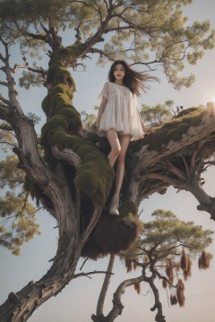 1girl,<lora:枯枝1:0.8>,standing on a giant tree,from low angle,from below,The color contrast,light and shadow processing,