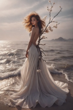 1girl,<lora:枯枝1:0.8>,This picture depicts a surrealistic image of a woman blending with natural elements. A woman stands in the water,her back and hair gradually turning into branches and twigs of a tree,<lora:天涯海角:0.5>,wave,
