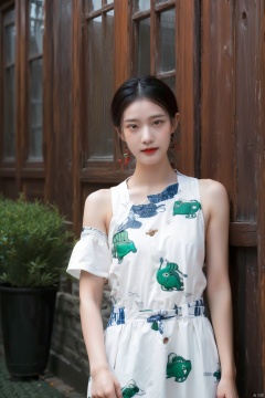 The image features a confident young woman standing outdoors on a green carpet. She is wearing a white dress with a green alligator print and carries a brown shoulder bag. Her posture and facial expression convey a sense of determination. The lighting is soft and flattering, casting a warm glow on her skin. The color palette is predominantly green and brown, with a dynamic contrast between the two. The woman's outfit, pose, and facial expression all work together to create a powerful and memorable image., 1girl