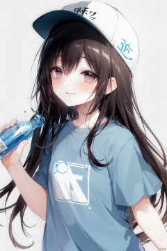 solo, 1girl, bottle, holding bottle, blush, water bottle, holding, dated, brown eyes, hair between eyes, hat, long hair, clothes writing, short sleeves, flat cap, sweat, platelet \(hataraku saibou\), blue shirt, shirt, brown hair, looking at viewer, bangs, character name, open mouth, very long hair, white background, :o, white headwear
