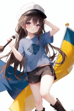 solo, 1girl, brown shorts, flat cap, blush, long hair, shorts, holding, platelet \(hataraku saibou\), boots, hat, very long hair, brown eyes, holding flag, open mouth, shirt, short sleeves, black footwear, hair between eyes, blue shirt, white background, standing on one leg, :d, flag, bangs, smile, brown hair, standing, character name, short shorts, looking at viewer, simple background, clothes writing, grey headwear, upper teeth only, hands up, notice lines, teeth, white headwear, dated