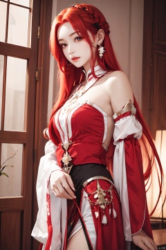 1girl, red_hair, solo, long_hair, detached_sleeves, earrings