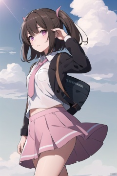 xiaohua,  1girl,  solo,  brown hair,  pink eyes,  cloud,  sky,  looking at viewer,  hair ornament, full_body, school skirt,<lora:EMS-251184-EMS:1.000000>