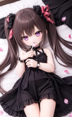 (cowboy shot,very long hair:1),acfd4dd522MI, 1girl, dress, solo, brown_hair, food, black_dress, black_nails, twintails, lying, candy, looking_at_viewer, lollipop, hat, long_hair, on_stomach, purple_eyes, mini_hat, sleeveless, sleeveless_dress, wrist_cuffs, holding, nail_polish, bare_shoulders, holding_food, black_headwear, blush, petals, holding_candy, holding_lollipop, bangs