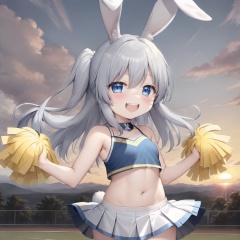 <lora:rabbit_girl_xl:0.8>,looking at viewer,blush,smile,open mouth,blue eyes,skirt,shirt,hair ornament,navel,holding,bare shoulders,standing,collarbone,tail,white hair,:d,grey hair,thighs,cowboy shot,pleated skirt,outdoors,sky,sleeveless,choker,midriff,cloud,miniskirt,stomach,blue skirt,crop top,bare arms,sleeveless shirt,white skirt,blue shirt,sunset,cheerleader,pom pom \(cheerleading\),holding yellow pom poms,