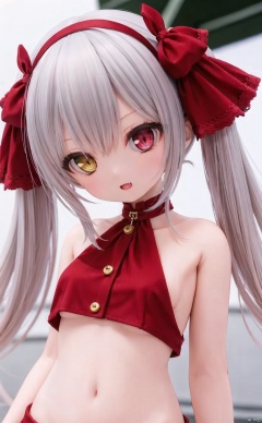 (cowboy shot,very long hair:1),acfd4dd522MI,1girl,heterochromia,virtual_youtuber,red_hair,houshou_marine,yellow_eyes,twintails,solo,red_eyes,open_mouth,looking_at_viewer,jewelry,underboob,earrings,fang,chain,blush,long_hair,hairband,upper_body,bare_shoulders,bangs,bow,