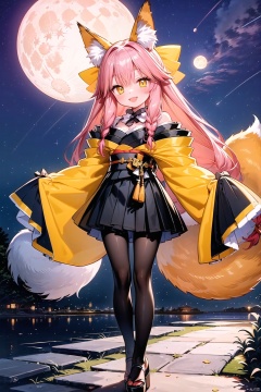 ((best quality)), ((masterpiece)), ((ultra-detailed)), (illustration), (detailed light), (an extremely delicate and beautiful), ((trim)), 1girl, tamamo \(fate\), tamamo no mae \(fate/extra\), solo, animal ears, aged down, moon, tail, pantyhose, pink hair, fox tail, fox ears, yellow eyes, long hair, official alternate costume, japanese clothes, full moon, night, sky, smile, star \(sky\), looking at viewer, sash, wide sleeves, black pantyhose, bow, night sky, starry sky, blush, kimono, hair bow, long sleeves, full body, sleeves past wrists, skirt,