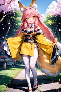 ((best quality)), ((masterpiece)), ((ultra-detailed)), (illustration), (detailed light), (an extremely delicate and beautiful), ((trim)), 1girl, solo, long hair, yellow eyes, animal ears, japanese clothes, tamamo \(fate\), tail, fox ears, looking at viewer, tamamo no mae \(fate/extra\), fox tail, red hair, smile, kimono, pantyhose, bow, cherry blossoms, outdoors, official alternate costume, sash, wide sleeves, hair bow, pink hair, bridge, obi, very long hair, bare shoulders, standing, blush, full body, white pantyhose,(petite child:1.2), tree