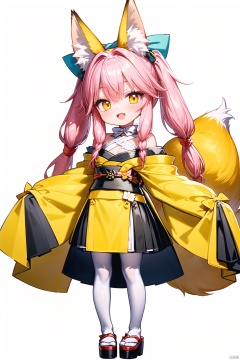 1girl, full body, pink hair, yellow eyes, animal ears, twintails, (fox ears, fox Tail), hair ornament, solo,looking at viewer,standing,