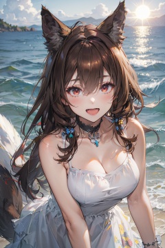 masterpiece,best quality,1girl,solo,looking at viewer,brown hair,hair between eyes,bangs,very long hair,red eyes,wolf ears,wolf tail,blush,open mouth,smile,:d,fang,large breasts,bare shoulders,(white sundress),upper body,leaning forward,outdoors,sun,sea,beach,day,blurry background,<lora:endfield-000004:0.7>,