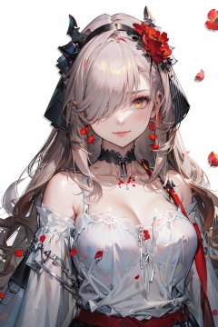 masterpiece,best quality,1girl,solo,looking at viewer,silver hair,yellow eyes,beautiful and detailed face,evil smile,upper body,collarbone,collarbone,large breasts,white long translucent night gown,expressionless,hair cover one eye,long hair,red hair flower,standing,blood,(plenty of red petals:1.35),white background,simple background,<lora:endfield-000004:0.7>,