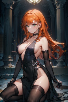 masterpiece,best quality,cowboy shot,looking at viewer,1girl,solo,orange hair,green eyes,:3,large breasts,collarbone,black evening gown,elbow gloves,black gloves,black thighhighs,kneeling,<lora:endfield-000004:0.7>,