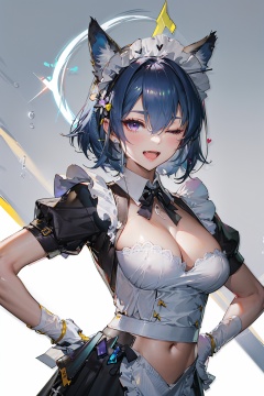 masterpiece,best quality,ultra-detailed.extremely delicate and beautiful,hard light,embrandt style expression of light and shadow,depth of field,dynamic angle,1girl,solo,looking at viewer,:d,fang,halo,fox ears,large breasts,cleavage,blue hair,purple eyes,one eye closed,hair between eyes,maid,maid headdress,navel,maid apron,one hand on hip,one hand on head,heart,white background,skin oil,<lora:endfield-000004:0.7>,