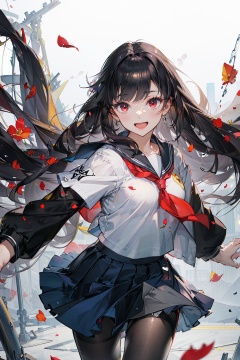 (best quality),((masterpiece)),(highres),illustration,original,extremely detailed,1girl,pantyhose,long hair,solo,school uniform,black hair,serafuku,skirt,black pantyhose,red eyes,petals,hime cut,smile,open mouth,very long hair,<lora:endfield-000004:0.7>,