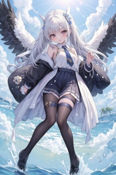 1girl,skirt,solo,shirt,long hair,(thigh strap:1.5),white shirt,school uniform,holding,(pantyhose:1.3),white pantyhose,pleated skirt,black skirt,twintails,full body,