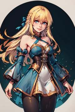 ((masterpiece,best quality)), absurdres,<lora:Marina_Lucce_Maxetto_OC:0.8>, Marina_Lucce_Maxetto_OC, 1girl, solo, blonde, very long hair, french braid,  blue hair ribbon, frilled choker, criss-cross halter, sleeveless dress, high-waist skirt, blue backless dress, waist bow, detached sleeves, frilled sleeves, wide sleeves, pantyhose, solo, smiling, looking at viewer, cowboy shot,hand on hip,