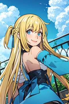 <lora:Alola_Style:0.65>,((masterpiece,best quality)), absurdres,<lora:Marina_Lucce_Maxetto_OC:0.8>, Marina_Lucce_Maxetto_OC, 1girl, solo, blonde, very long hair, french braid, big blue sleeve,blue hair ribbon, frilled choker, criss-cross halter, sleeveless dress, high-waist skirt, blue backless dress, waist bow, detached sleeves, frilled sleeves, wide sleeves, pantyhose, open back, solo, smiling, looking at viewer, from behind,