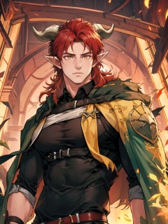 <lora:hedelei:1>,hedelei,horns,red hair,yellow eyes,, masterpiece,best quality, 1boy, cowboy shot