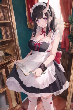 nengdai,1girl, horns, breasts, oni horns, solo, purple eyes, maid headdress, official alternate costume, thighhighs, apron, white apron, dress, cleavage, looking at viewer,standing, plant, black thighhighs, black hair, maid apron, maid, large breasts, black dress, long hair, bare shoulders, detached collar, strapless, strapless dress, indoors, menu, bangs, black garter straps, potted plant, book, x hair ornament, jewelry, medium breasts, heart, wooden floor, couch, lips, garter straps, collar, feet out of frame, white dress, flower, skirt, chair, black skirt, frills, bracelet, horn ornament, earrings, bookshelf, hand on own thigh, frilled apron, waist apron, white collar, short dress, zettai ryouiki, blunt bangs