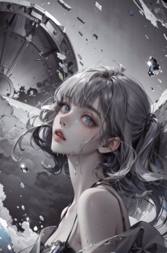 (absurdres, highres, ultra detailed),masterpiece,best quality,upper body,1girl,small breasts,dam,monochrome,polar opposites,wet hair,mismatched pupils,scared,upside-down