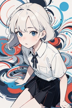 masterpiece,best quality,upper body,1girl,collared_shirt and flared_skirt as material3,limited palette,abstract,relationship graph,asymmetrical bangs,small breasts,upturned eyes,._.,from above