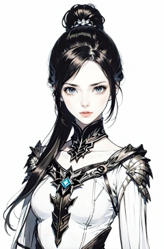 masterpiece,best quality,upper body,1girl,small breasts,Extremely beautiful clothes(different stlyes),white theme,g-pen \(medium\),negative space,low ponytail,symbol-shaped pupils,anger vein,hatching \(texture\)