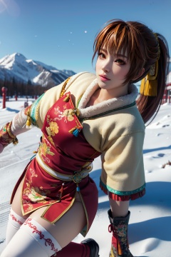 masterpiece,high quality,kasumi,brown eyes,1girl,solo,looking_at_viewer,<lora:add_detail:0.3>,3D graphics,brown hair,ponytail,white thighhighs,simple background,outdoors,(snow),snowflakes,<lora:kasumi-000003:0.75>,chinese clothes,china dress,new year,