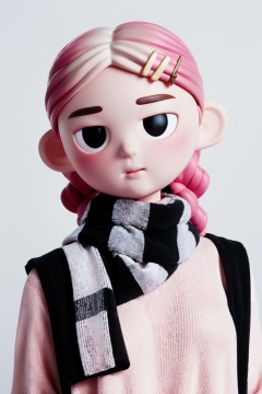 Best quality,masterpiece,ultra high res,yuan_3D_character,1girl,solo,hairclip,hair ornament,scarf,pink hair,black eyes,sweater,gradient background,braid,upper body,(white background:1.5),<lora:3D_character_v1.0:0.8>,