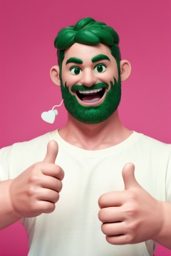 Best quality,masterpiece,ultra high res,yuan_3D_character, 1boy, male focus, heart, short hair, smile, looking at viewer, thick eyebrows, thumbs up, shirt, apron, upper body, green apron, white shirt, open mouth, hand up, meme, pink background, muscular,<lora:3D_character_v1.0:0.8>,