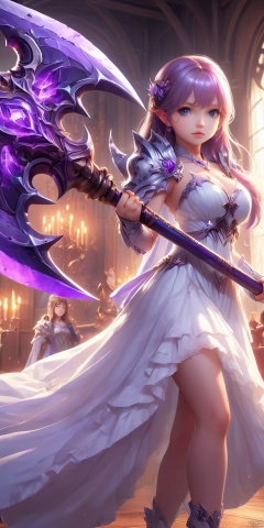 an action shot of a cute little girl wielding a giant purple battleaxe, wearing a white dress, 8K, HD, amazing quality, throneroom in background, anime style, anime, HD, masterpiece, best quality, hyper detailed, ultra detailed, realistic, Atomictits