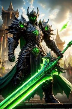 Action shot of a knight wearing black armor, wielding a giant green sword, green glowing eyes, torn cape, temple in background, HD, masterpiece, best quality, hyper detailed, ultra detailed, Naturalbody
