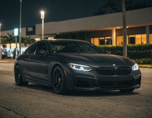 cinematic photo of black matte BMW in Miami, perfect lighting, vibrant, high detailed, epic, movie still, film grain