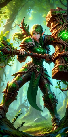 an action shot of a detailed and realistic image of a female fantasy game character wielding a giant tree battlehammer with vines, wearing green armor, amazing quality, forest allay in background, HD, masterpiece, best quality, hyper detailed, ultra detailed, realistic, MAJICMIX STYLE