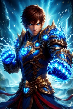 an detailed and realistic image of a fantasy game character wielding glowing water fist gauntles, wearing blue armor, amazing quality, water allay in background, digital art, HD, masterpiece, best quality, hyper detailed, ultra detailed, Fist Gauntlets, guangying on face