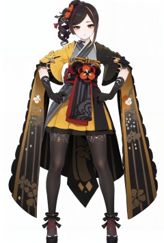 8k, best quality, masterpiece, (ultra-detailed:1.1), (high detailed skin), (full body:1.2), white background, standing, looking at viewer, (solo:1.4), hand on hip, <lora:qianzhi-v100:0.8:lbw=OUTALL>, qianzhi, 1girl, gloves, black gloves, hair ornament, japanese clothes, pantyhose, kimono, red eyes, flower, black footwear, multicolored hair, (white background, simple background:1.5), (beautiful_face), ((intricate_detail)), clear face, ((finely_detailed)), fine_fabric_emphasis, ((glossy)), full_shot