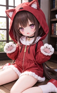 (cowboy shot,very long hair:1),4349,1girl,solo,long_hair,smile,sitting,looking_at_viewer,open_mouth,wariza,bangs,window,:d,blush,animal_hands,gloves,hands_up,socks,very_long_hair,hood,paw_gloves,animal_hood,brown_hair,long_sleeves,indoors,white_socks,hood_up,
