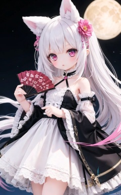 (cowboy shot,very long hair:1),4349,1girl, solo, animal_ears, hand_fan, rabbit_ears, long_hair, holding, flower, dress, moon, detached_sleeves, white_hair, hair_flower, holding_fan, looking_at_viewer, full_moon, white_dress, hair_ornament, multicolored_hair, bare_shoulders, very_long_hair, wide_sleeves, bangs, long_sleeves, folding_fan, pink_hair, blush, pink_eyes