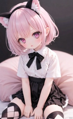 (cowboy shot,very long hair:1),4349,1girl,solo,animal_ears,pink_hair,thighhighs,skirt,sitting,shirt,pink_eyes,chair,white_shirt,black_skirt,looking_at_viewer,bow,short_hair,white_background,black_bow,between_legs,frilled_skirt,short_sleeves,cat_ears,argyle,argyle_legwear,hand_between_legs,bowtie,simple_background,animal_ear_fluff,frills,bangs,blush,collared_shirt,