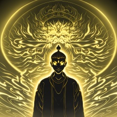 a man standing in front of a projection of immortal,halo,<lora:eastern_mythology_xl:0.7>,golden line,tangka,
